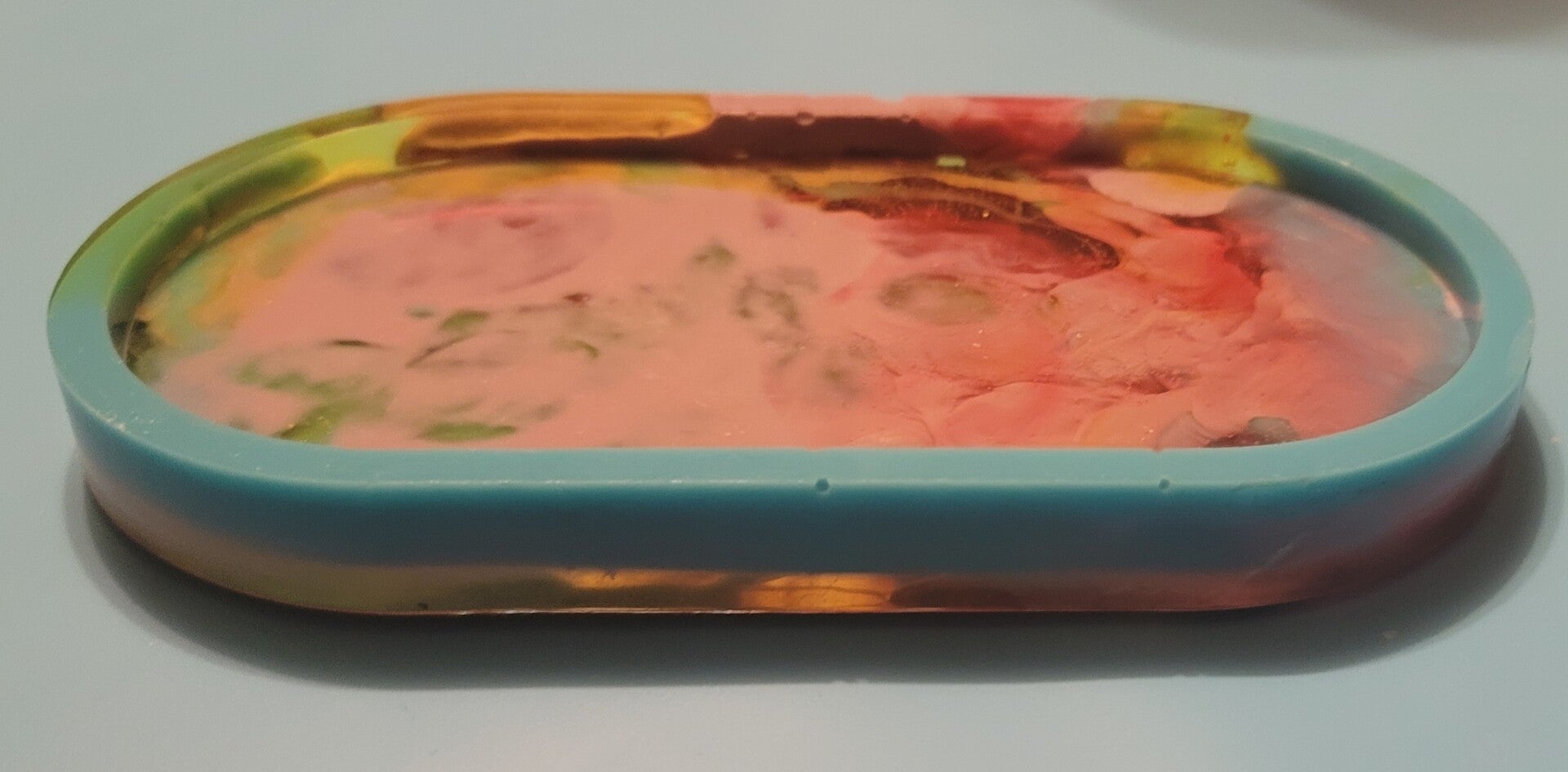 blue, transparent yellow, transparent red, purple; colors are swirled