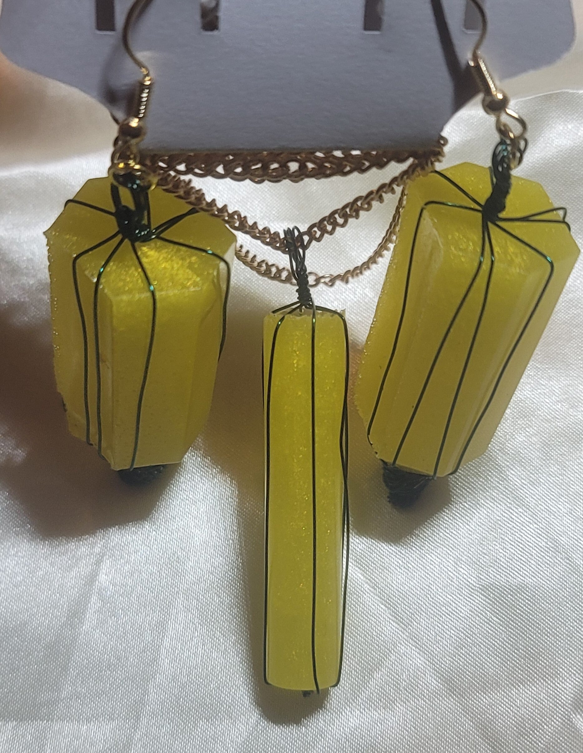 yellow resin gems wire wrapped in green wire; gold split rings, hooks, & chain