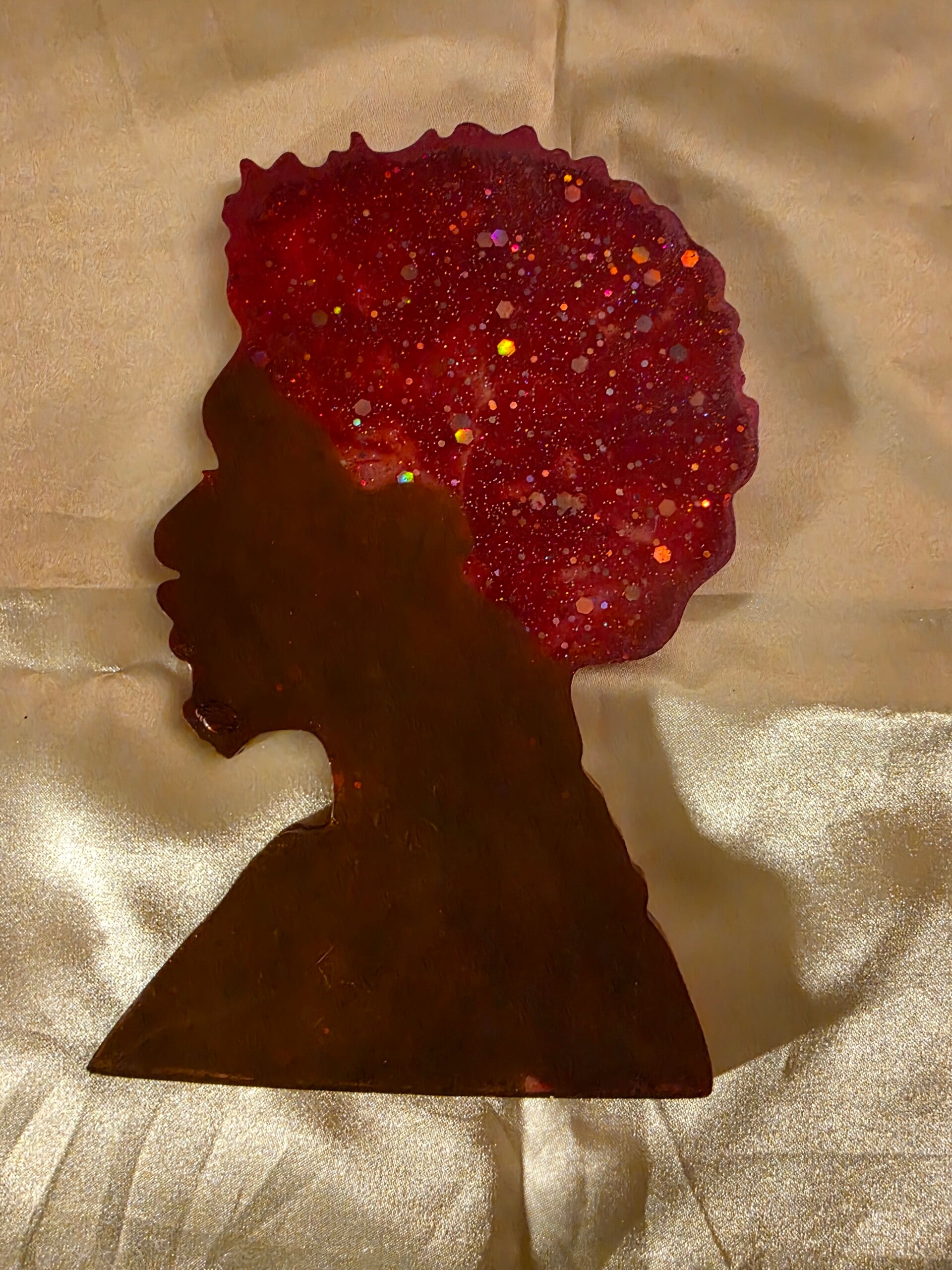 brown face, holographic red glitter, red, alcohol ink afroman coaster